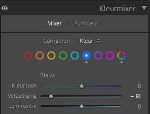 Nu gaan we nog een stapje verder. Scroll naar beneden en ga naar de kleurmixer. Ziet jouw Lightroom er anders uit? Waarschijnlijk staat er achter ‘corrigeren’ nu HSL. Klik daarop en selecteer ‘Kleur.’ Ga vervolgens naar de kleur blauw en haal de verzadiging omlaag. De hond wordt direct minder blauw.