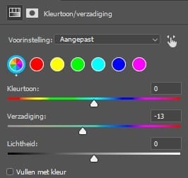Ga naar kleurtoon/verzadiging. Haal de verzadiging omlaag. Nu wordt alleen de héle foto aangepast en dat wil je niet. Keer het masker (Ctrl + i) om en kleur met de brush over de gele delen in de foto. Zorg dat je de tong en ogen niet aanpast.