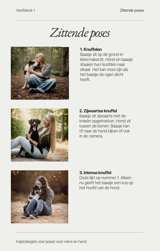 In deze gids vind jij 17 poses voor mens en hond. Zo hoef jij nooit meer na te denken welke poses jij wilt fotograferen als je een baasje met zijn of haar hond voor de lens hebt. Het is een e-book dus je kan deze zelfs erbij pakken als je de shoot hebt! Of even in de auto spieken voordat de shoot begint.